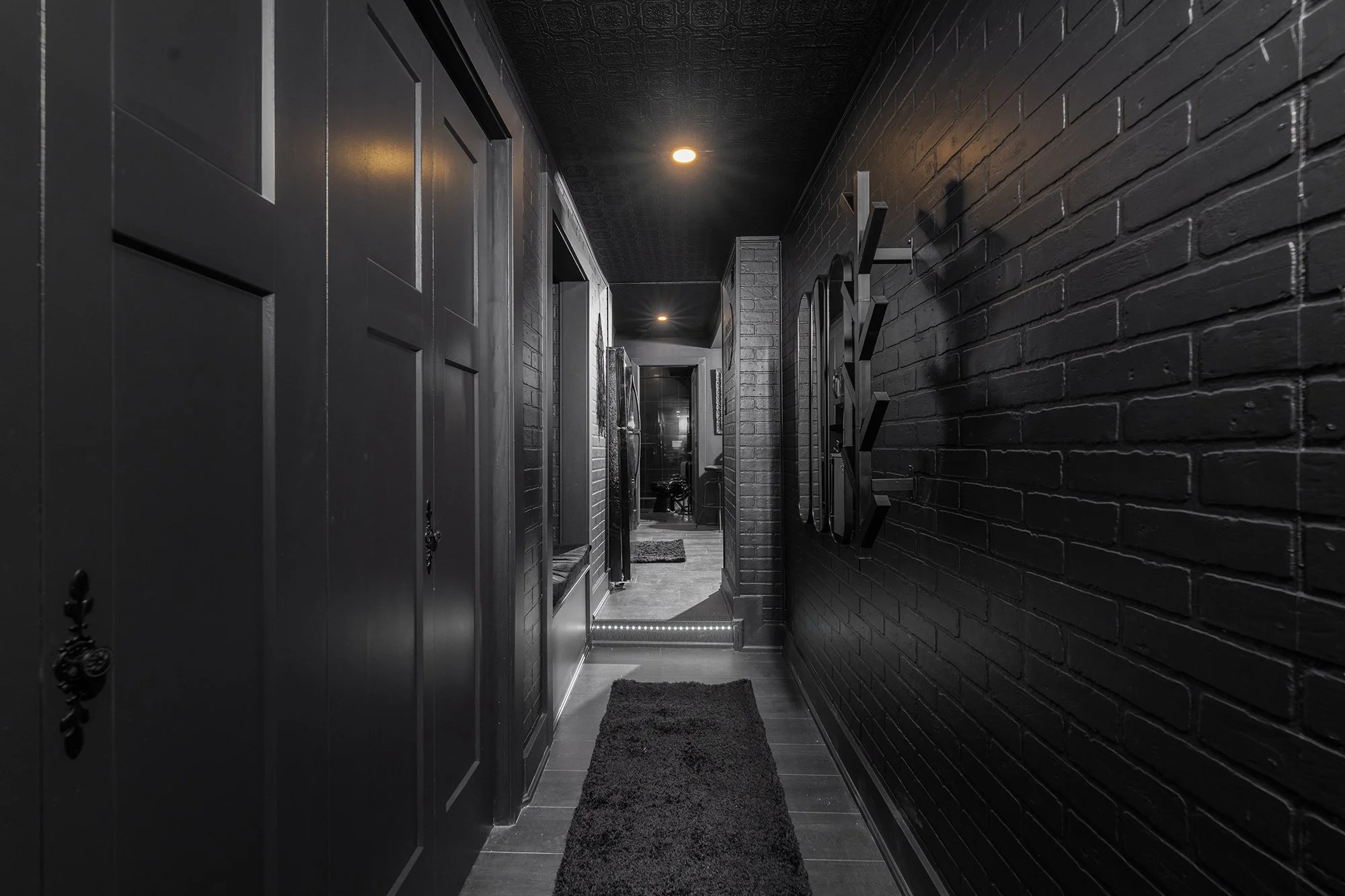 The Black Room is a vibe. We've never seen anything quite like it. Wall to wall black, the room focuses on different textures and shades to make it an unforgettable experience for anyone who enjoys the colour black. Modern and sophisticated, the black room is a one level 420 sf room complete with full kitchen, full 4 pc completely black bathroom including custom tile shower, a bedroom with a king bed, 50" and chandelier, along with a living room with a 65" tv, electric fireplace, velvet couch and a fold out love seat! The extra special part of this room is a full size glass railing front balcony overlooking Erie Rd! Have we mentioned the full automated black out shades for a truly unique black out experience?